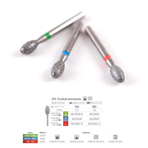 FRESA DE DIAMaNTE FG PARA TURBINA CON FORMA FOOTBaLL REDONDEaDO DE DIAMETRO 018 Y TAMAÑO DE GRANO GRUESO (COLOR VERDE)..PRESENTACION EN BLISTER DE 5 UNIDADES..VELOCIDAD RECOMENDADA ENTRE 42000 Y 85000 RPM.